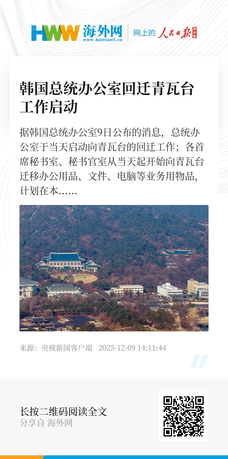 据韩国总统办公室9日公布的消息,总统办公室于当天启动向青瓦台的回迁工作;各首席秘书室、秘书官室从当天起开始向青瓦台迁移办公用品、文件、电脑等业务用物品,计划在本月末结束搬迁工作。