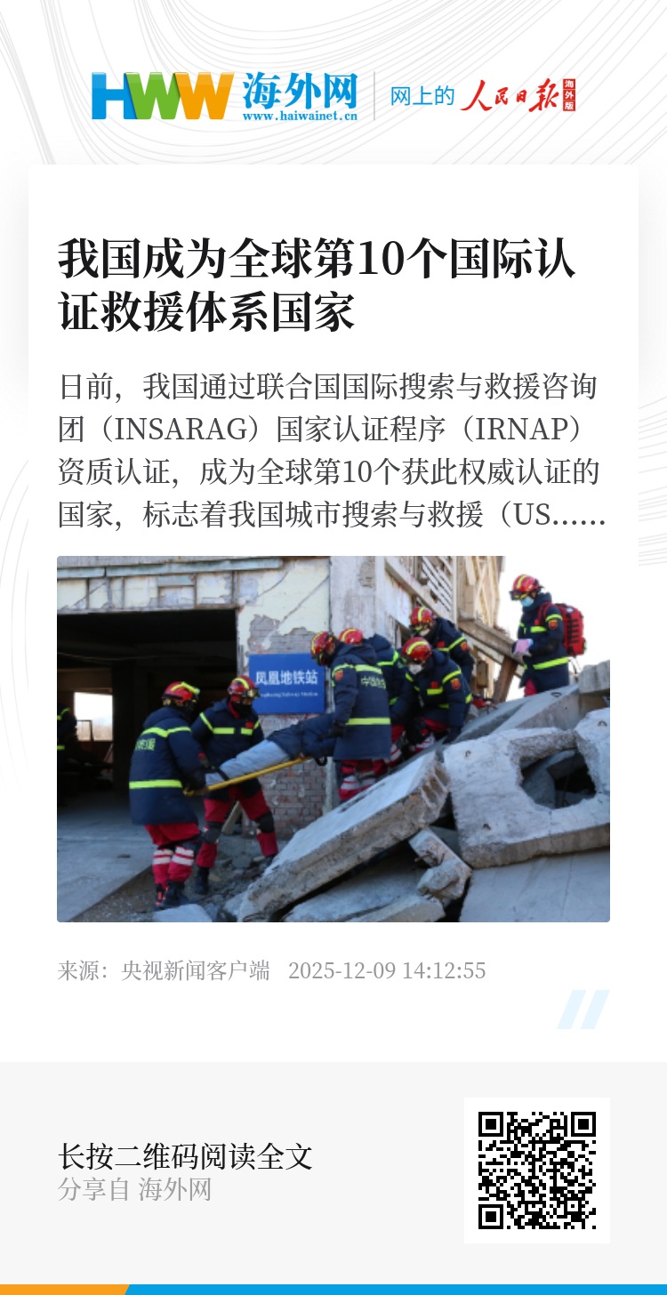 日前,我国通过联合国国际搜索与救援咨询团(INSARAG)国家认证程序(IRNAP)资质认证,成为全球第10个获此权威认证的国家,标志着我国城市搜索与救援(USAR)体系达到国际先进水平,救援能力获国际社会高度认可。认证通过后,我国获联合国INSARAG正式授权,可对国内救援队伍开展能力测评,对达标队伍授予INSARAG专属标识徽章,推动其成为国际认可的专业救援力量。