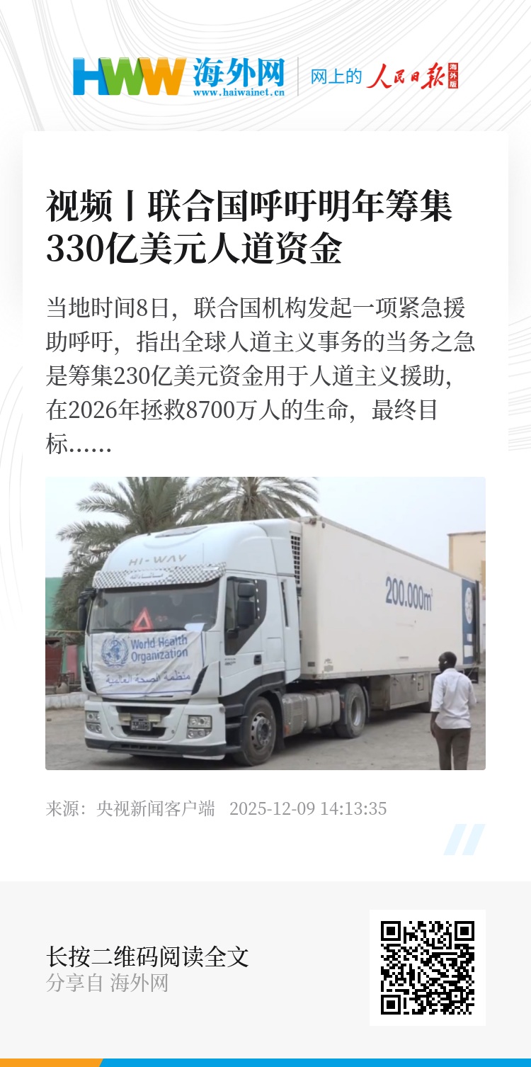 当地时间8日,联合国机构发起一项紧急援助呼吁,指出全球人道主义事务的当务之急是筹集230亿美元资金用于人道主义援助,在2026年拯救8700万人的生命,最终目标是在2026年筹集330亿美元。