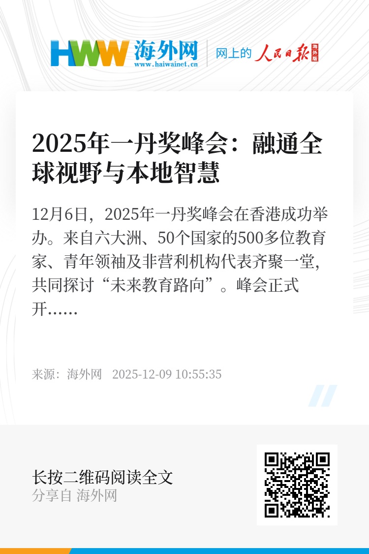 12月6日,2025年一丹奖峰会在香港成功举办。来自六大洲、50个国家的500多位教育家、青年领袖及非营利机构代表齐聚一堂,共同探讨“未来教育路向”。峰会正式开始前,全场起立默哀,哀悼香港大埔火灾遇难者,共同表达国际教育界对香港的支持。峰会期间,一丹奖还与团结香港基金、香港大学教育学院、联合国难民署、香港慈善基金会联盟(Hong Kong Foundation Exchange)及教育科技初创企业 Lirvana Lab 多个合作伙伴举办了一系列周边活动。