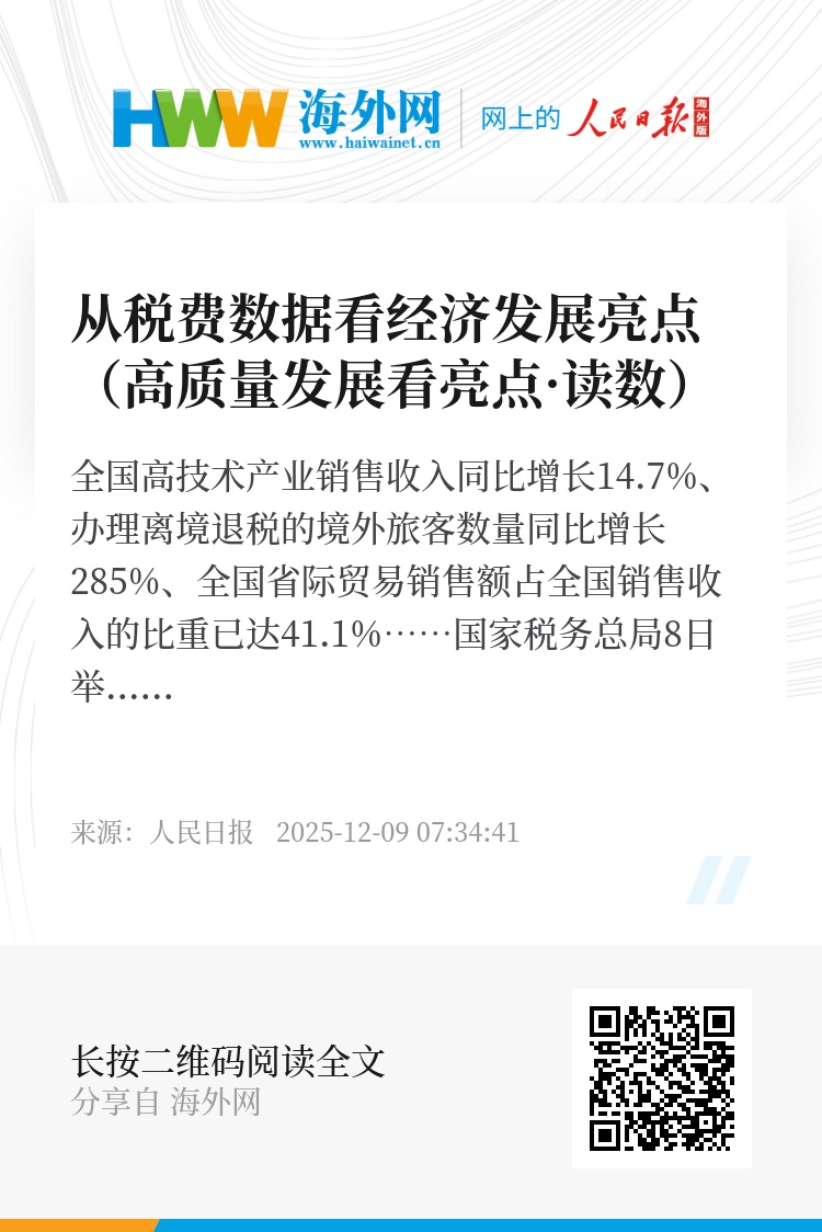 全国高技术产业销售收入同比增长14.7%、办理离境退税的境外旅客数量同比增长285%、全国省际贸易销售额占全国销售收入的比重已达41.1%……国家税务总局8日举行例行新闻发布会,今年前11个月的税费数据亮点纷呈。我国制造业高质量发展有哪些新特点?消费市场呈现出哪些新变化?跨区域税费服务改革取得哪些新成果?让我们通过记者的观察和解读,窥见税费数据背后中国经济发展的韧性与活力。