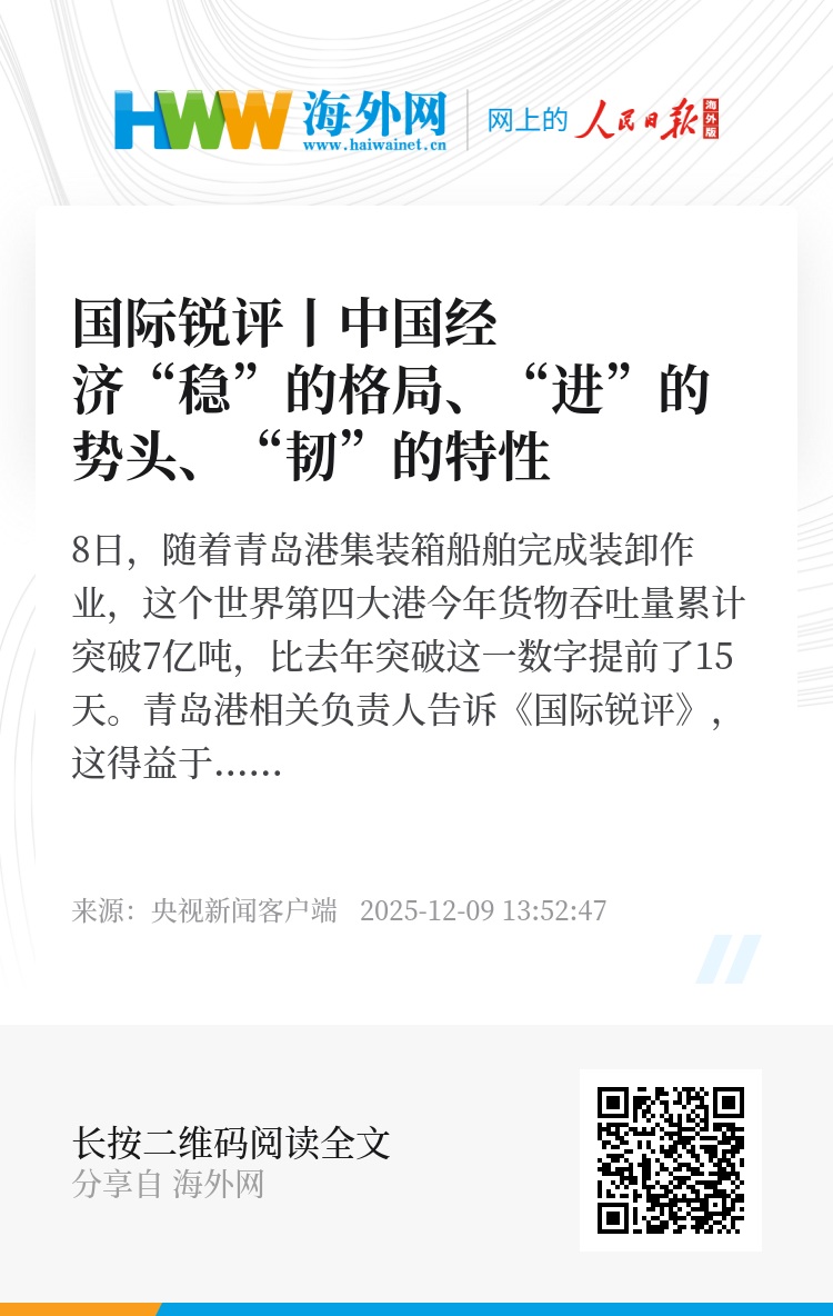 临近年底,“十四五”即将圆满收官,“十五五”篇章将要开启。8日,中共中央政治局召开会议,其中一项内容是分析研究2026年经济工作,实现“十五五”良好开局。9日,中国将同多个国际经济组织举办“1+10”对话会,共商全球治理、共谋全球发展。世界期待来自中国的“机遇清单”,也期待与中国合作共赢。正如埃及埃中商会秘书长迪亚·赫尔米所说,“中国坚持高水平对外开放,为世界繁荣注入了强劲动力”。