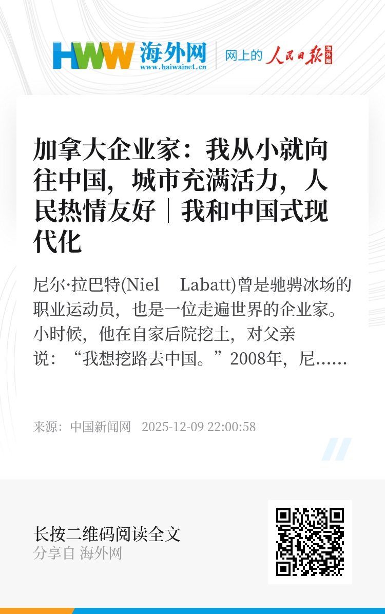 尼尔·拉巴特(Niel Labatt)曾是驰骋冰场的职业运动员,也是一位走遍世界的企业家。小时候,他在自家后院挖土,对父亲说:“我想挖路去中国。”2008年,尼尔·拉巴特第一次踏上了中国的土地。北京的繁华、上海的现代、四川的火锅,让这位加拿大人看到了真正的中国。尼尔·拉巴特表示,他对中加两国长期关系表示乐观,并认为两国都能从中获利。