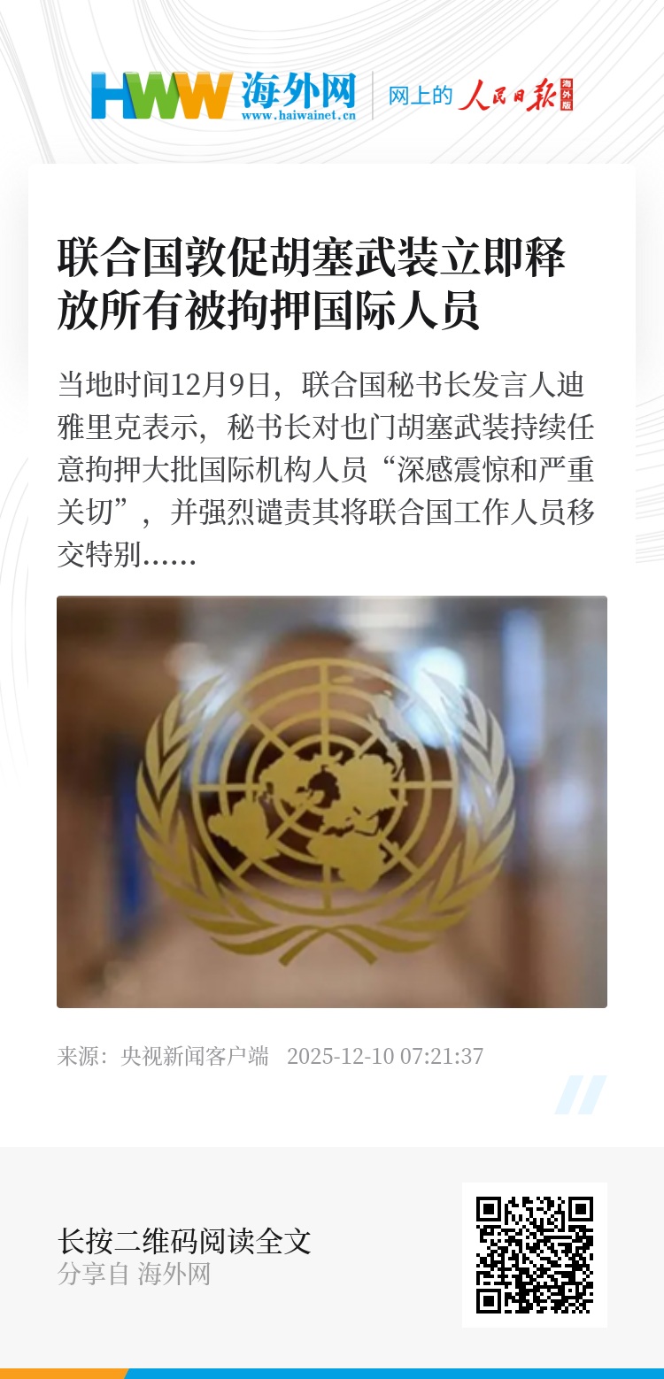 当地时间12月9日,联合国秘书长发言人迪雅里克表示,秘书长对也门胡塞武装持续任意拘押大批国际机构人员“深感震惊和严重关切”,并强烈谴责其将联合国工作人员移交特别刑事法院的做法。