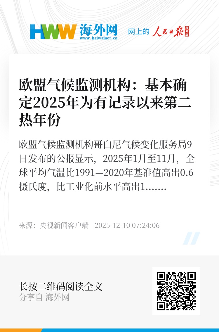 欧盟气候监测机构哥白尼气候变化服务局9日发布的公报显示,2025年1月至11月,全球平均气温比1991—2020年基准值高出0.6摄氏度,比工业化前水平高出1.48摄氏度。