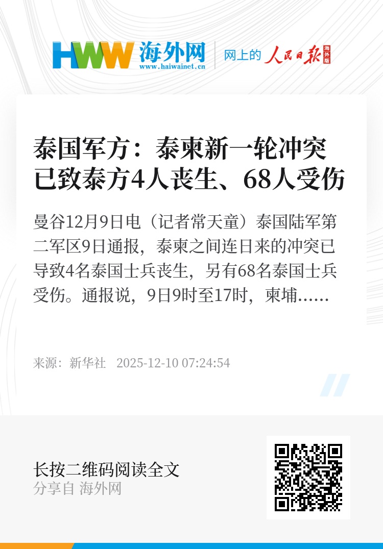 新华社曼谷12月9日电(记者常天童)泰国陆军第二军区9日通报,泰柬之间连日来的冲突已导致4名泰国士兵丧生,另有68名泰国士兵受伤。