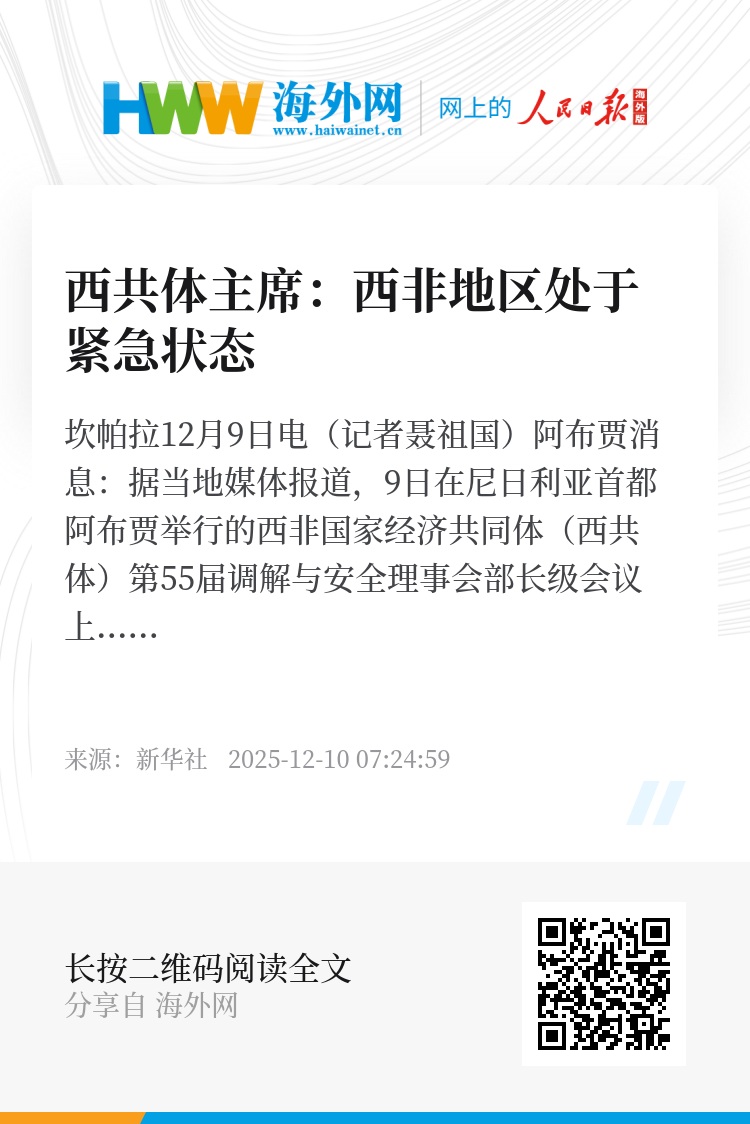 新华社坎帕拉12月9日电(记者聂祖国)阿布贾消息:据当地媒体报道,9日在尼日利亚首都阿布贾举行的西非国家经济共同体(西共体)第55届调解与安全理事会部长级会议上,西共体委员会主席奥马尔·图雷说,西非地区目前处于紧急状态。