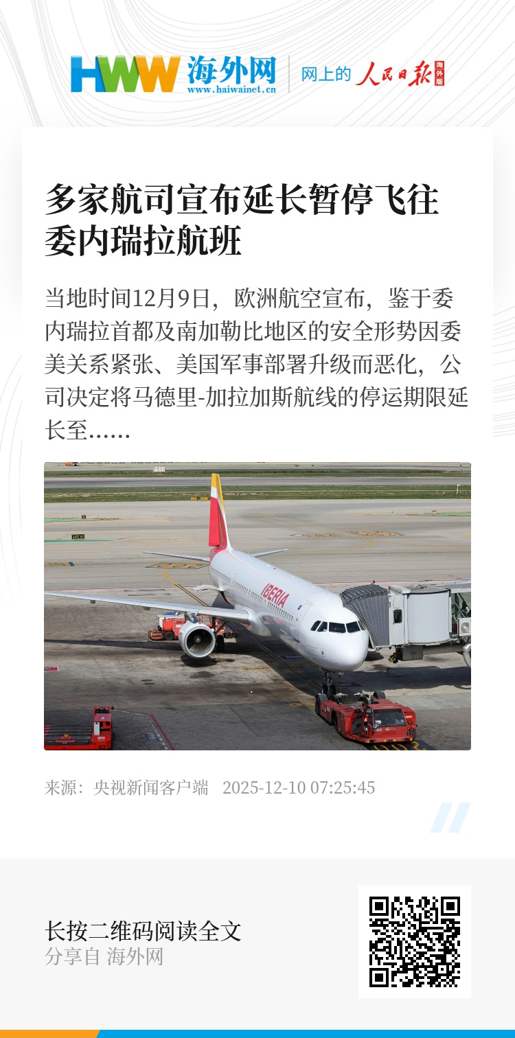 当地时间12月9日,欧洲航空宣布,鉴于委内瑞拉首都及南加勒比地区的安全形势因委美关系紧张、美国军事部署升级而恶化,公司决定将马德里-加拉加斯航线的停运期限延长至12月19日。欧洲航空表示,已为受影响乘客开通特殊通道,可根据需要重新调整旅行计划或办理改签手续。