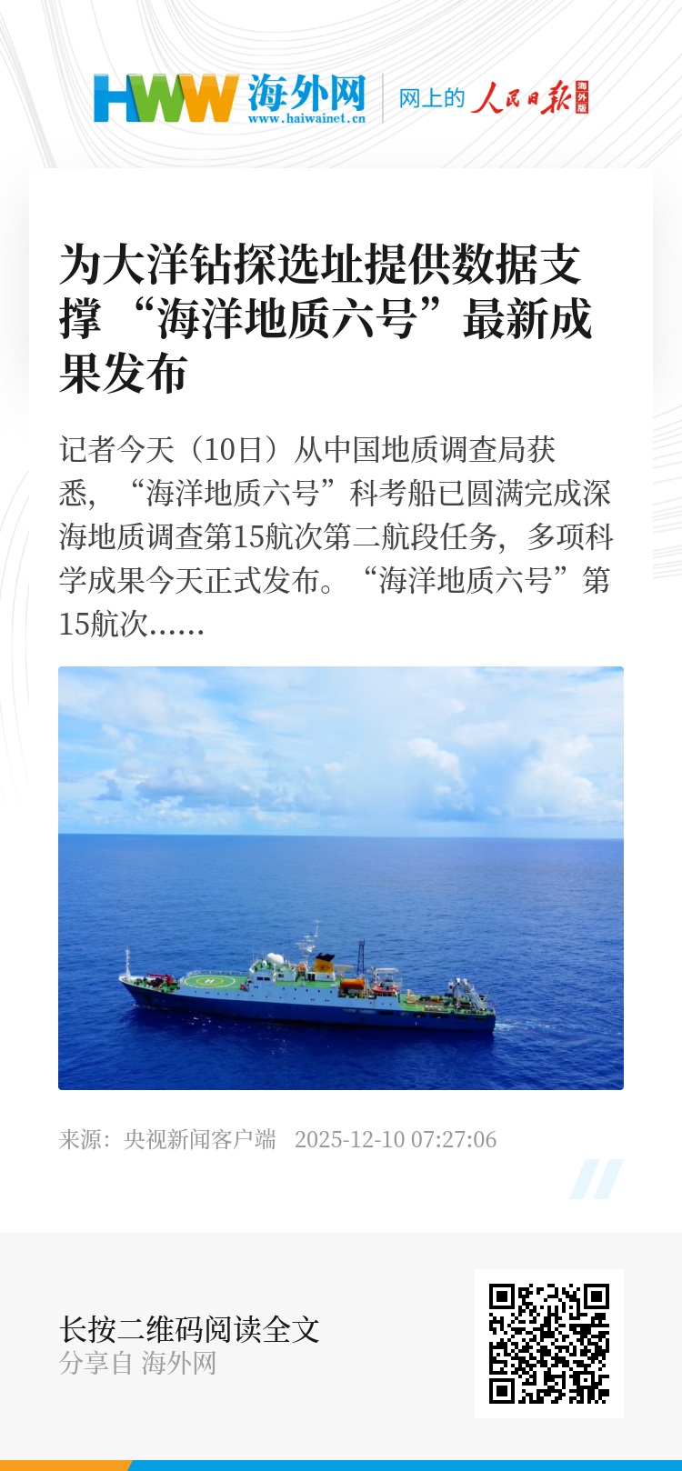 记者今天(10日)从中国地质调查局获悉,“海洋地质六号”科考船已圆满完成深海地质调查第15航次第二航段任务,多项科学成果今天正式发布。