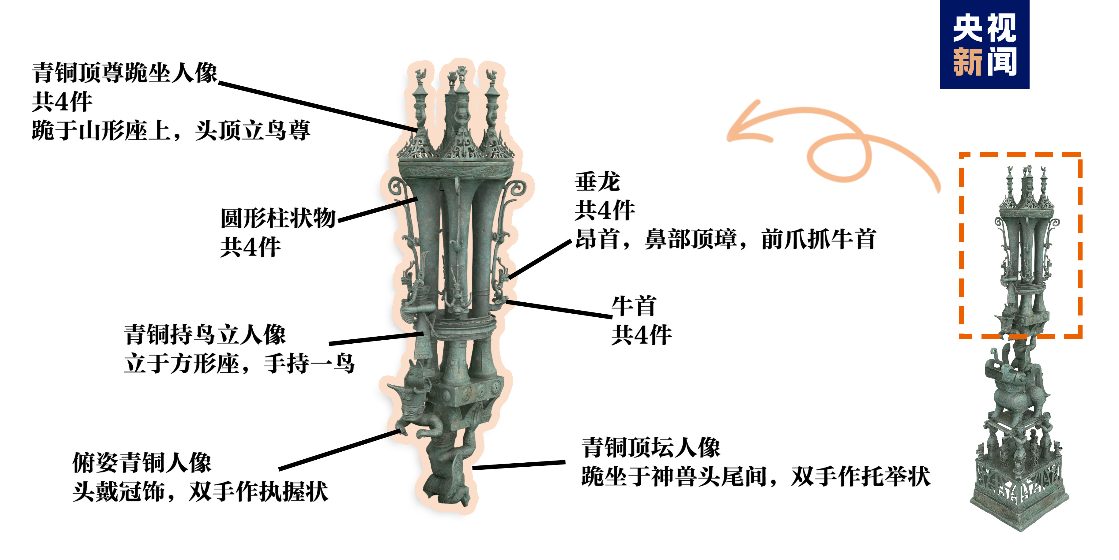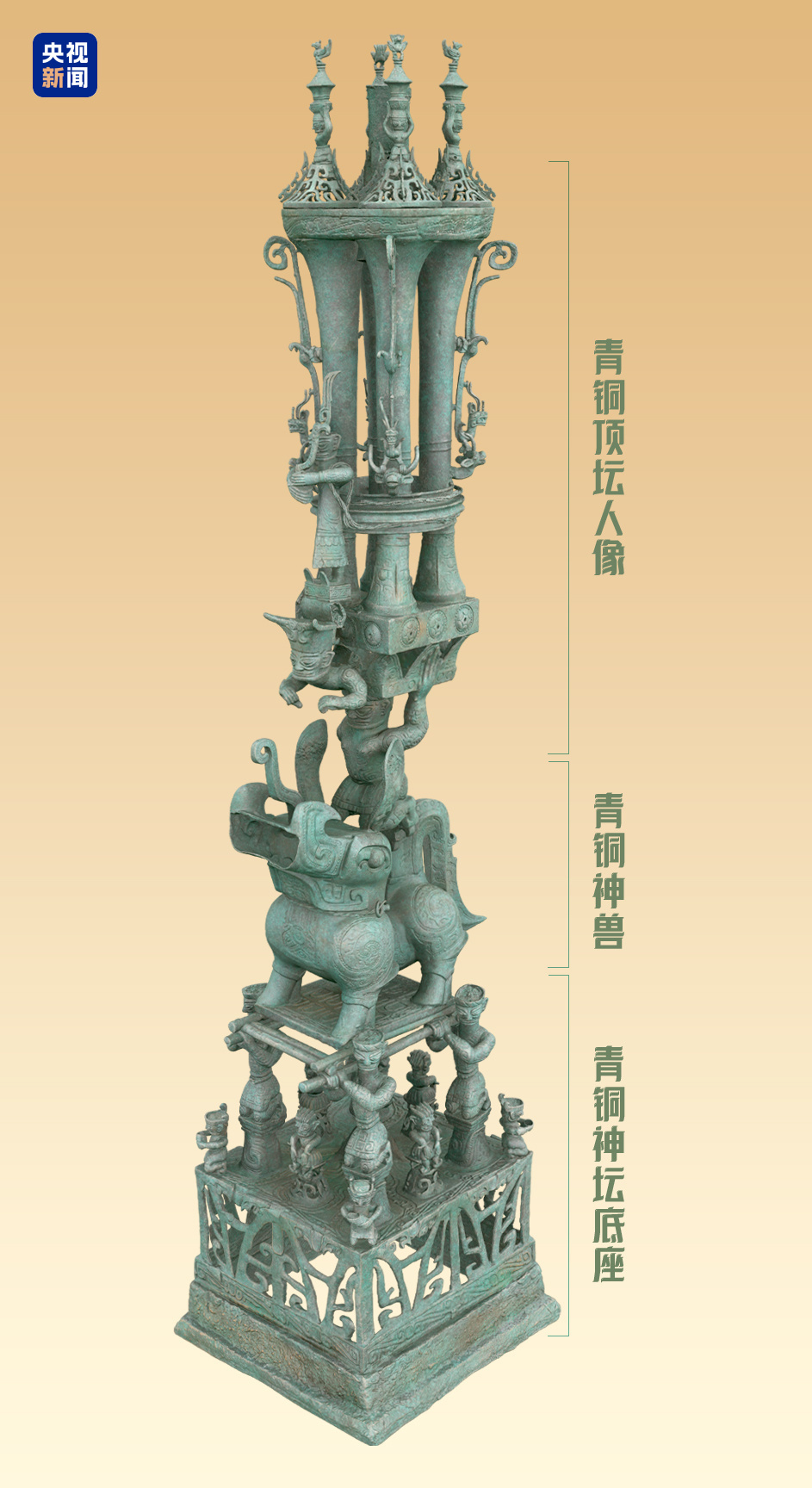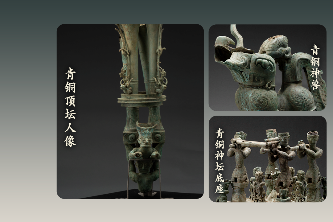 青铜神坛底座、青铜神兽、青铜顶坛人像