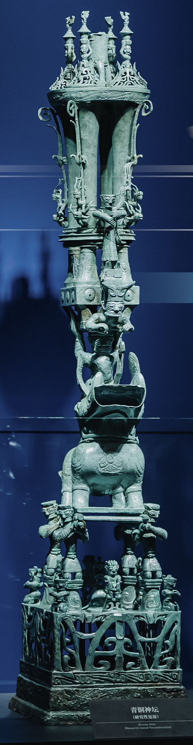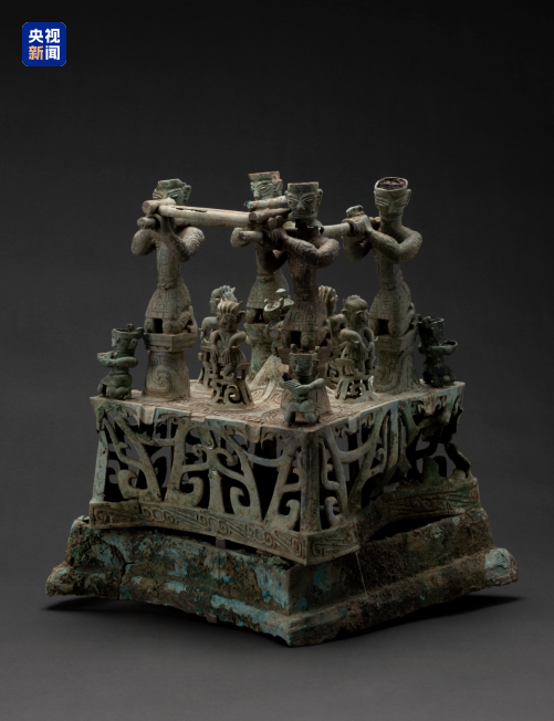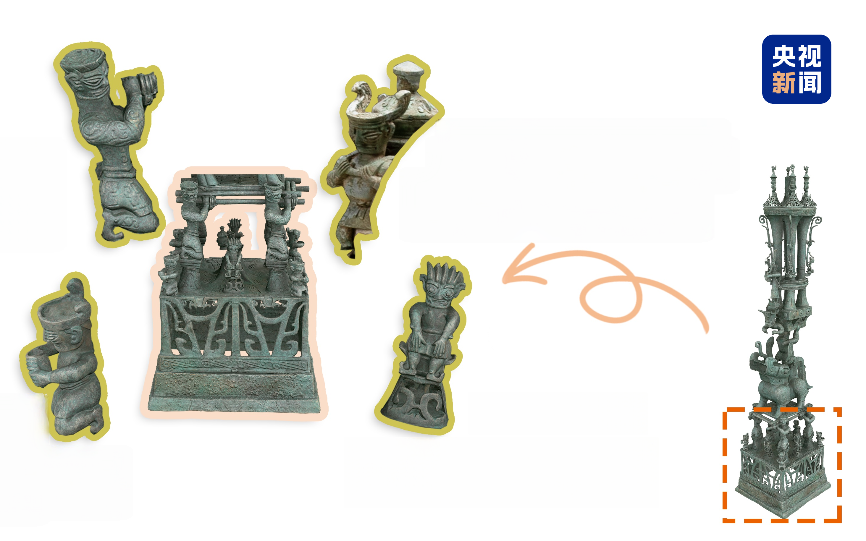 现有的青铜神坛底座台面之上,有9个还保留在上的人物造型。在研究性复原中,平台之上共有13个小型青铜人像。