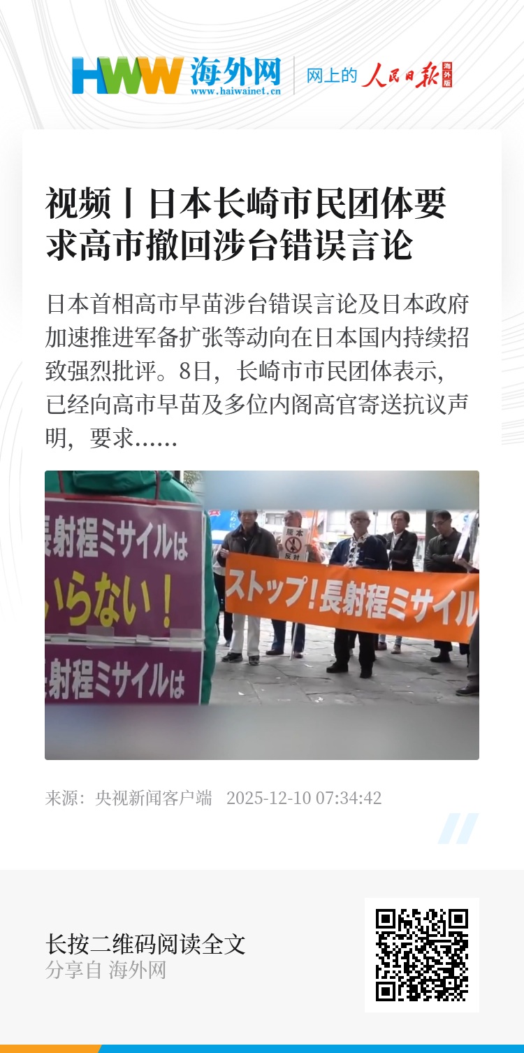 日本首相高市早苗涉台错误言论及日本政府加速推进军备扩张等动向在日本国内持续招致强烈批评。8日,长崎市市民团体表示,已经向高市早苗及多位内阁高官寄送抗议声明,要求高市撤回相关言论;此外,熊本市多个市民团体举行集会,反对日本政府部署远程导弹。