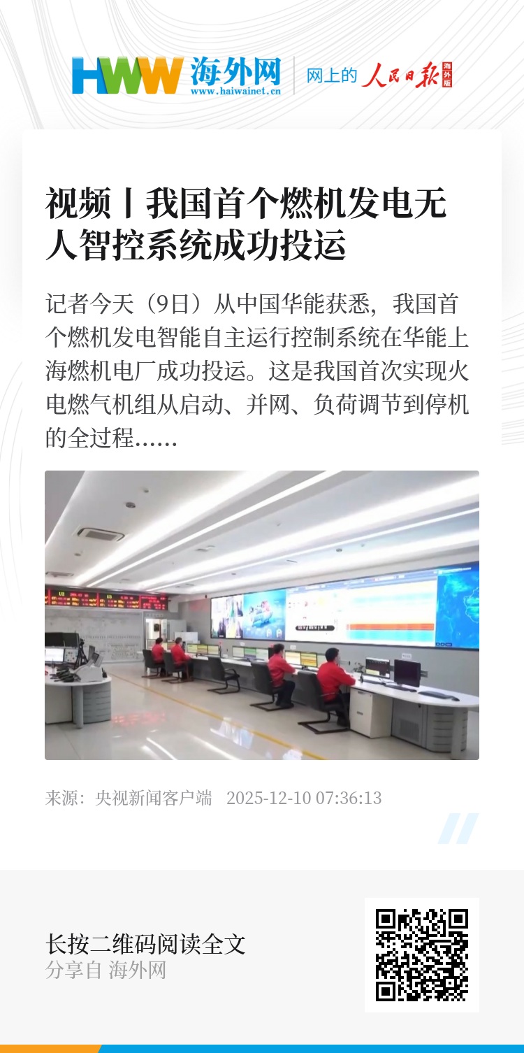 记者今天(9日)从中国华能获悉,我国首个燃机发电智能自主运行控制系统在华能上海燃机电厂成功投运。