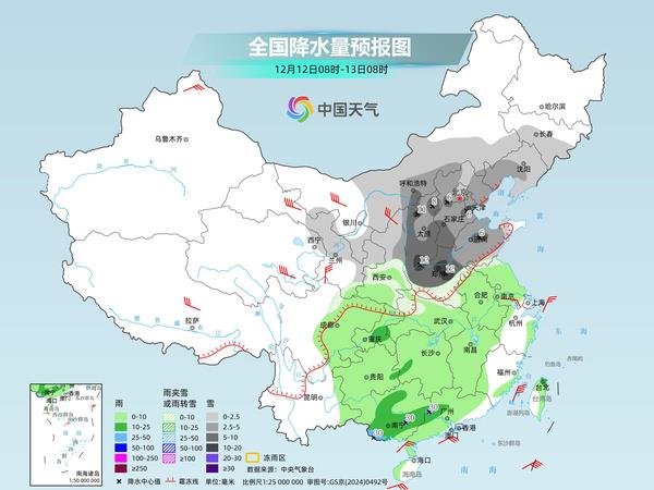 后天,内蒙古西部、东北地区中南部、甘肃中部、华北、黄淮、江汉西部等地部分地区有小到中雪或雨夹雪,其中,内蒙古中部、山西、河北中南部、辽宁中部、河南中北部等地局地大雪到暴雪。西南地区东部、江汉、江淮、江南、华南大部等地部分地区有小到中雨,其中,广西南部、广东西部等地部分地区有大雨。