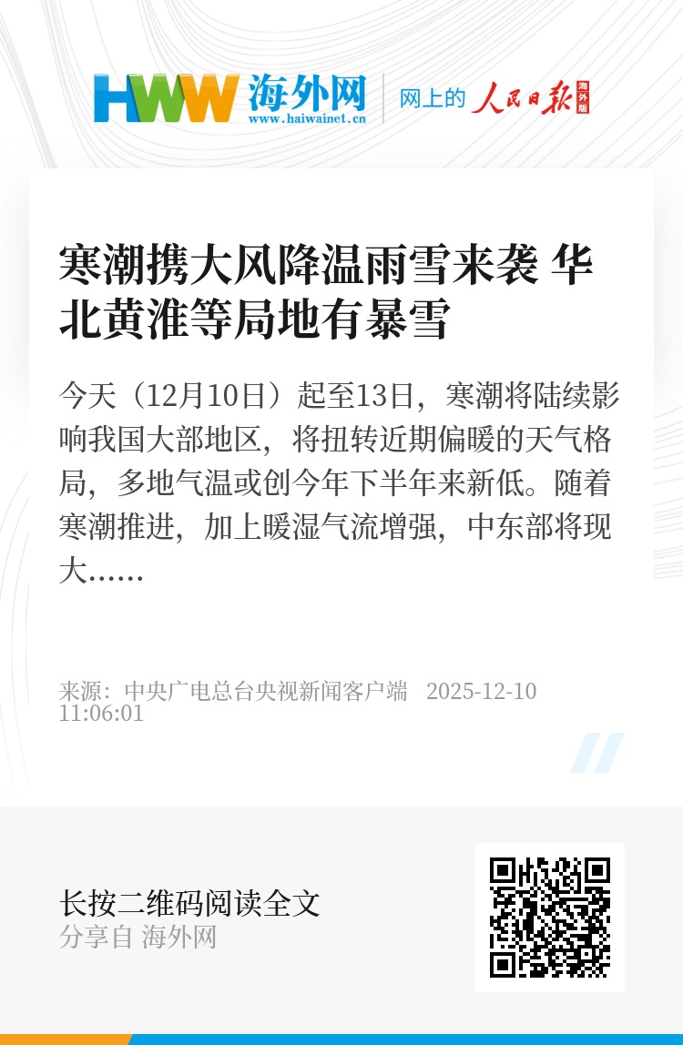 寒潮还将带来大范围雨雪天气,其中今天新疆将现较强降雪,明天雨雪主要影响西北和华北等地,后天进入本轮降水过程最强时段,华北、黄淮等地部分地区有大雪,局地暴雪,南方多地有中到大雨。