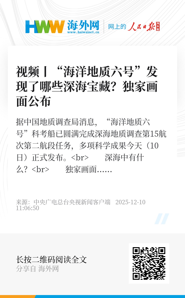 中国地质调查局广州海洋局“海洋地质六号”船技术负责人 宋来勇:将有力推动我们自研的深海探测装备走向生产、走向应用。我们获得的数据也为下一步在该区域进行更详细的地质调查提供了很好的基础。