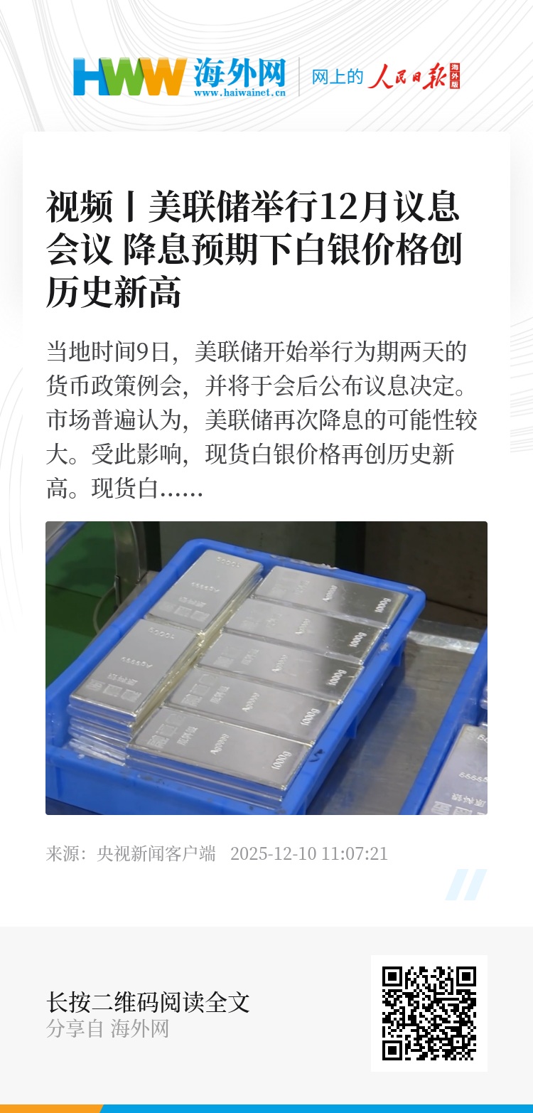 当地时间9日,美联储开始举行为期两天的货币政策例会,并将于会后公布议息决定。市场普遍认为,美联储再次降息的可能性较大。受此影响,现货白银价格再创历史新高。