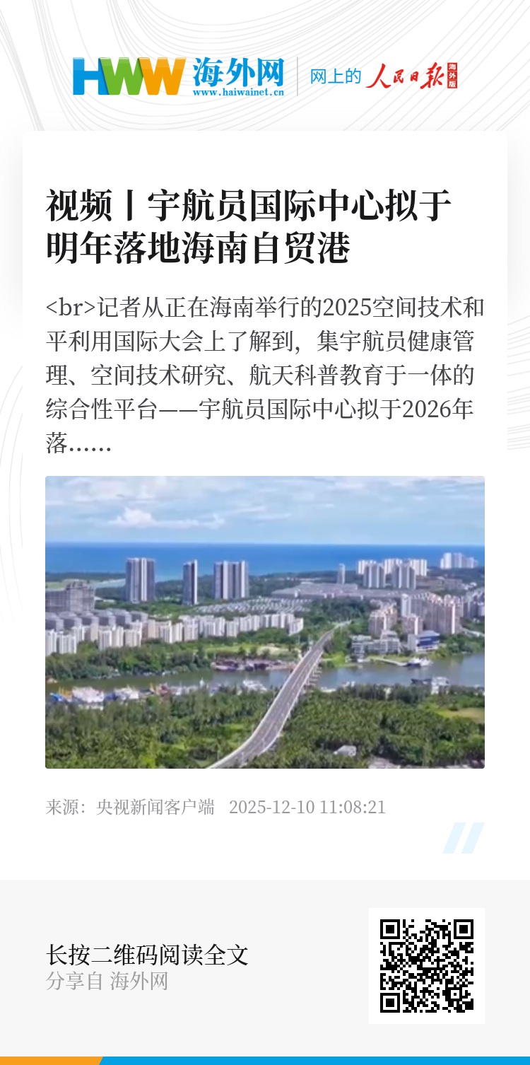 记者从正在海南举行的2025空间技术和平利用国际大会上了解到,集宇航员健康管理、空间技术研究、航天科普教育于一体的综合性平台——宇航员国际中心拟于2026年落地海南自贸港。