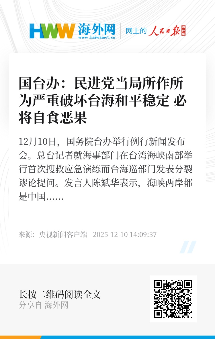 12月10日,国务院台办举行例行新闻发布会。总台记者就海事部门在台湾海峡南部举行首次搜救应急演练而台海巡部门发表分裂谬论提问。