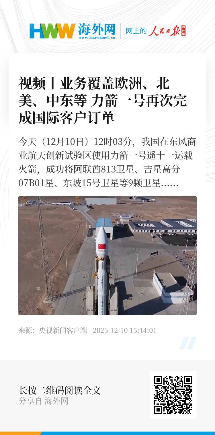 此次发射,力箭一号火箭再次服务国际客户,搭载了3颗外国卫星。目前,力箭一号已形成“高可靠发射—规模化订单—产业链协同”的良性循环。