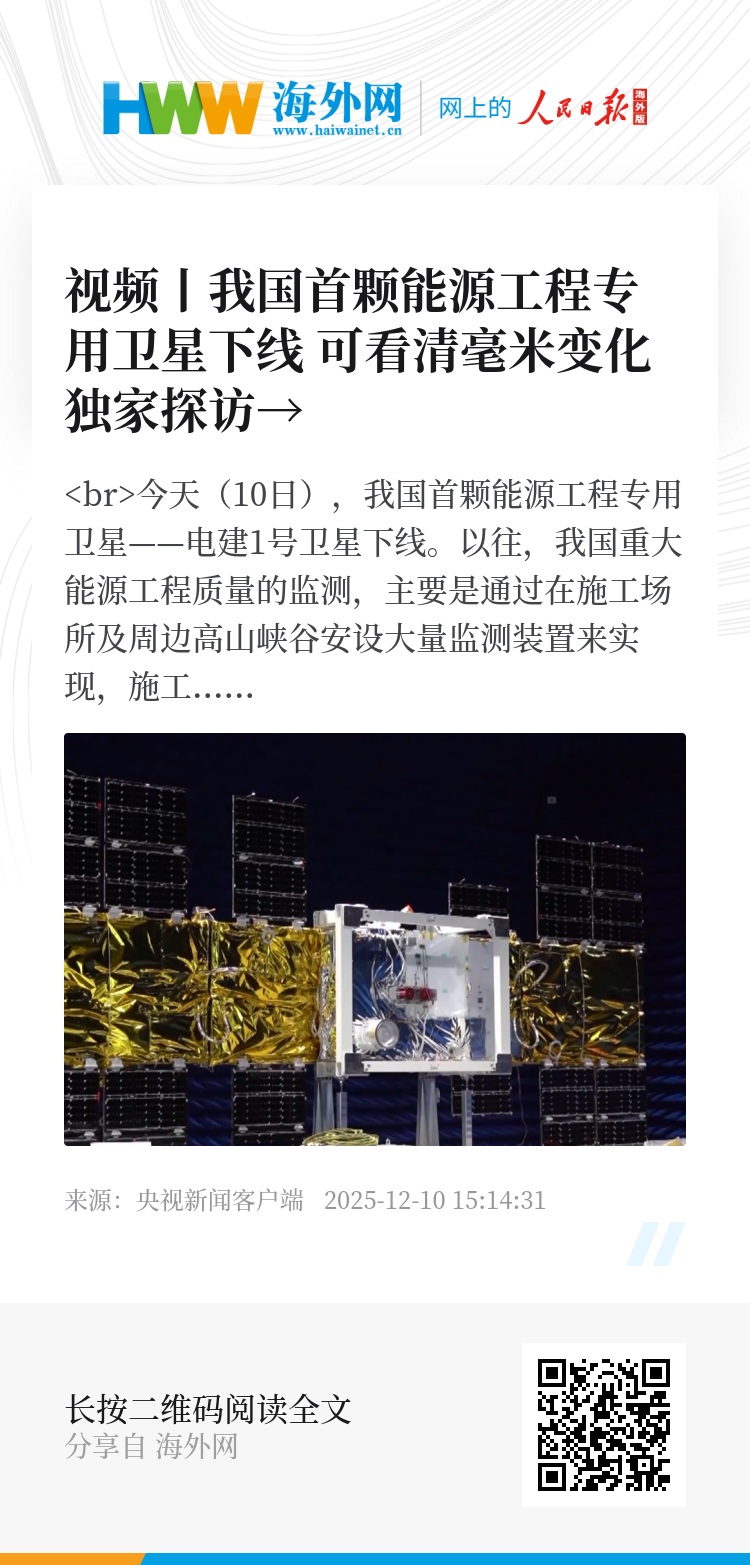 今天(10日),我国首颗能源工程专用卫星——电建1号卫星下线。以往,我国重大能源工程质量的监测,主要是通过在施工场所及周边高山峡谷安设大量监测装置来实现,施工难度大,精准度也有限。今天下线的这颗卫星可以在太空中以毫米级的精度,确保重大工程建设不差分毫。近日,总台央视记者对这颗卫星制造基地进行了独家探访。