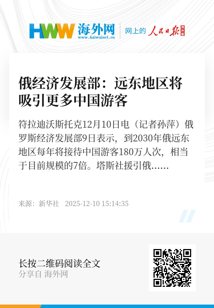新华社符拉迪沃斯托克12月10日电(记者孙萍)俄罗斯经济发展部9日表示,到2030年俄远东地区每年将接待中国游客180万人次,相当于目前规模的7倍。
