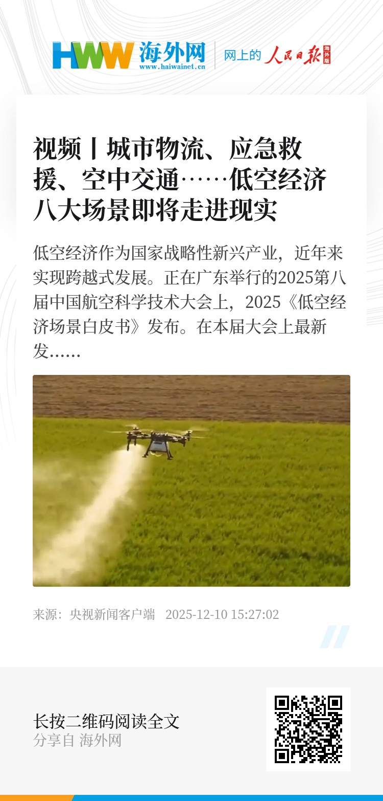 低空经济作为国家战略性新兴产业,近年来实现跨越式发展。正在广东举行的2025第八届中国航空科学技术大会上,2025《低空经济场景白皮书》发布。