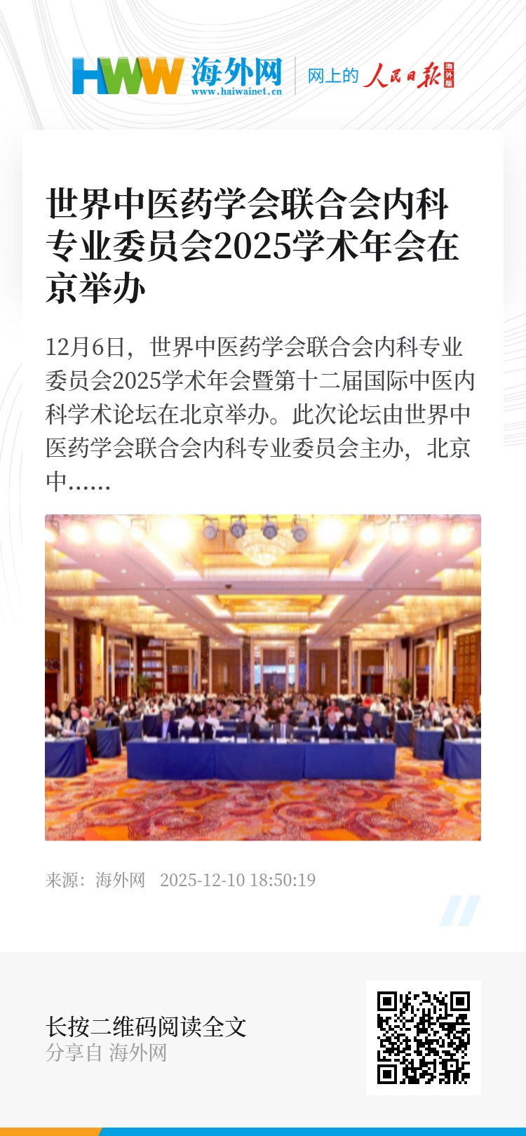 12月6日,世界中医药学会联合会内科专业委员会2025学术年会暨第十二届国际中医内科学术论坛在北京举办。此次论坛由世界中医药学会联合会内科专业委员会主办,北京中医药大学东直门医院承办,来自世界各地的专家学者与会,共谋中医药发展。