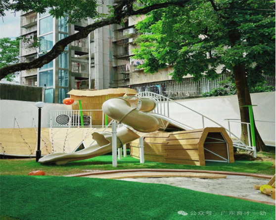 户外场地创新采用蜿蜒坡设计,科学划分沙水区、骑行区等功能区域,搭配树洞滑梯、彩虹爬网等特色设施,构建多元立体的户外游戏空间。