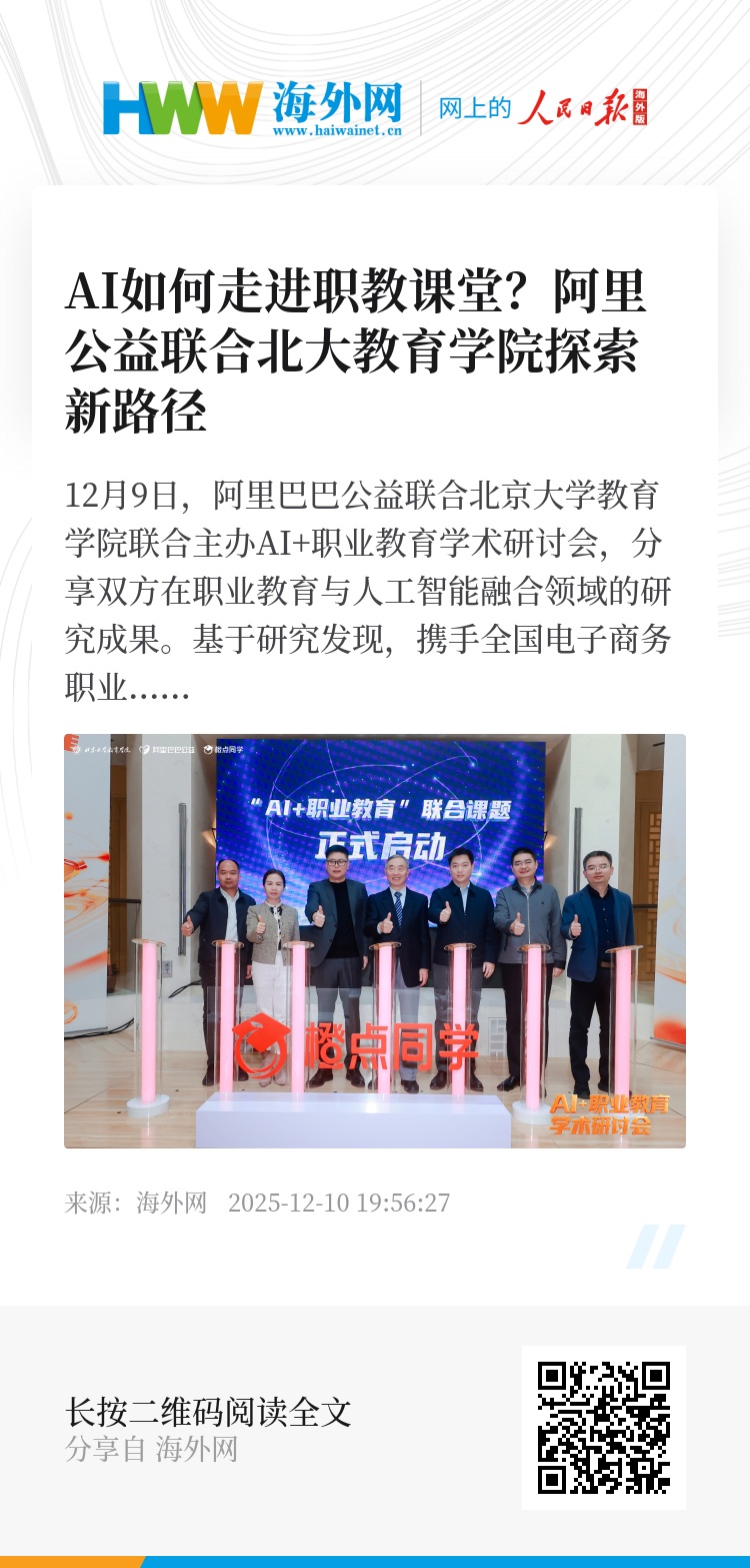 12月9日,阿里巴巴公益联合北京大学教育学院联合主办AI+职业教育学术研讨会,分享双方在职业教育与人工智能融合领域的研究成果。基于研究发现,携手全国电子商务职业教育教学指导委员会及多所职业院校,推出系统性解决方案,探索AI与职业教育深度融合的新路径。