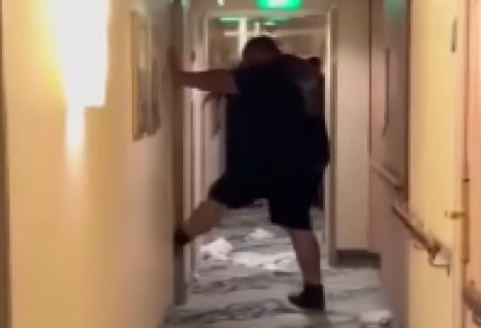 维吉尔在邮轮上踢踹房门(图:TMZ网站视频截图)