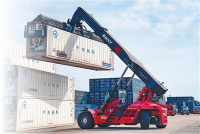 在中老铁路万象南货运口岸站,起重机吊起即将发往中国的冷链集装箱。