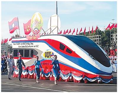 12月2日,以中老铁路“澜沧号”动车组车头为造型的花车亮相老挝建国50周年庆祝活动。