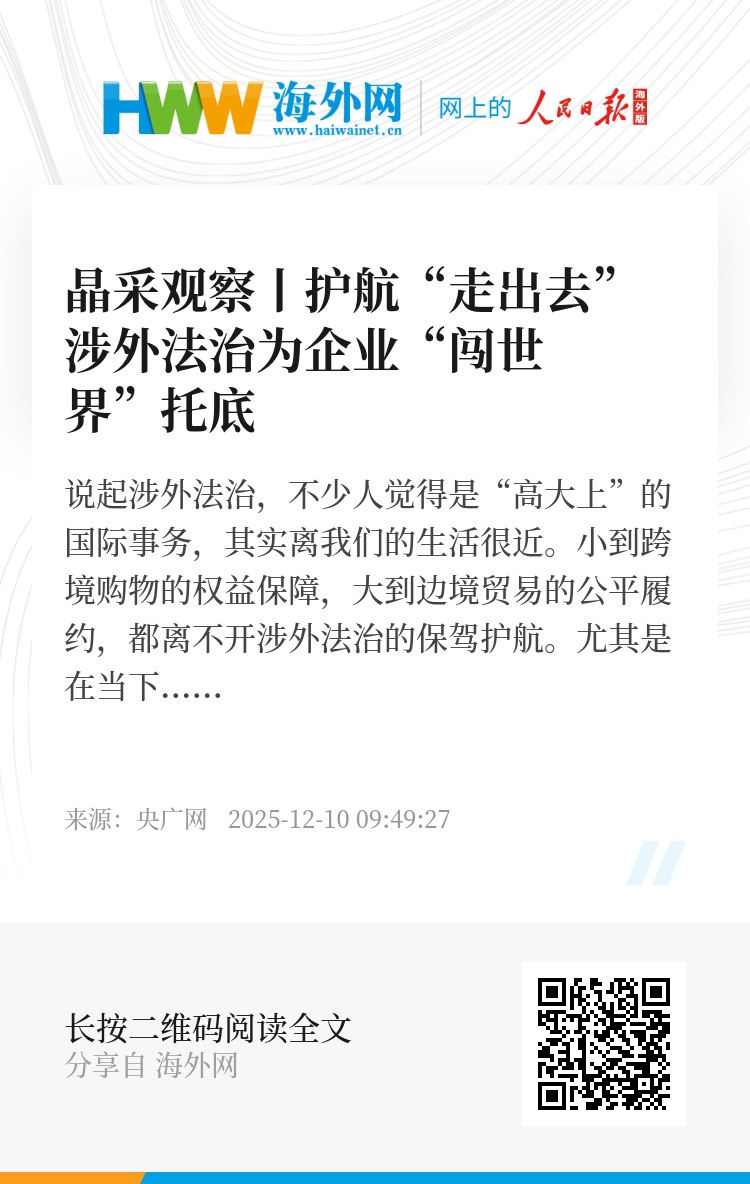 而这份坚实保障,也给企业和市场带来了看得见的公平。不管是外国企业还是国内企业的合法权益都得到有效平等的保护,让中外企业在同一个规则下竞争,生意做得更安心。说到底,涉外法治不是空洞的口号,而是侨胞的安心笑容,是外贸企业收到的欠款汇款,是被追回的每一分损失……它让我们知道,无论我们身在祖国家园,还是远赴异国他乡,总有国家的法治力量为我们遮风挡雨、护佑周全,这份稳稳的安全感,正是新时代涉外法治建设最贴心、最有力的成果。