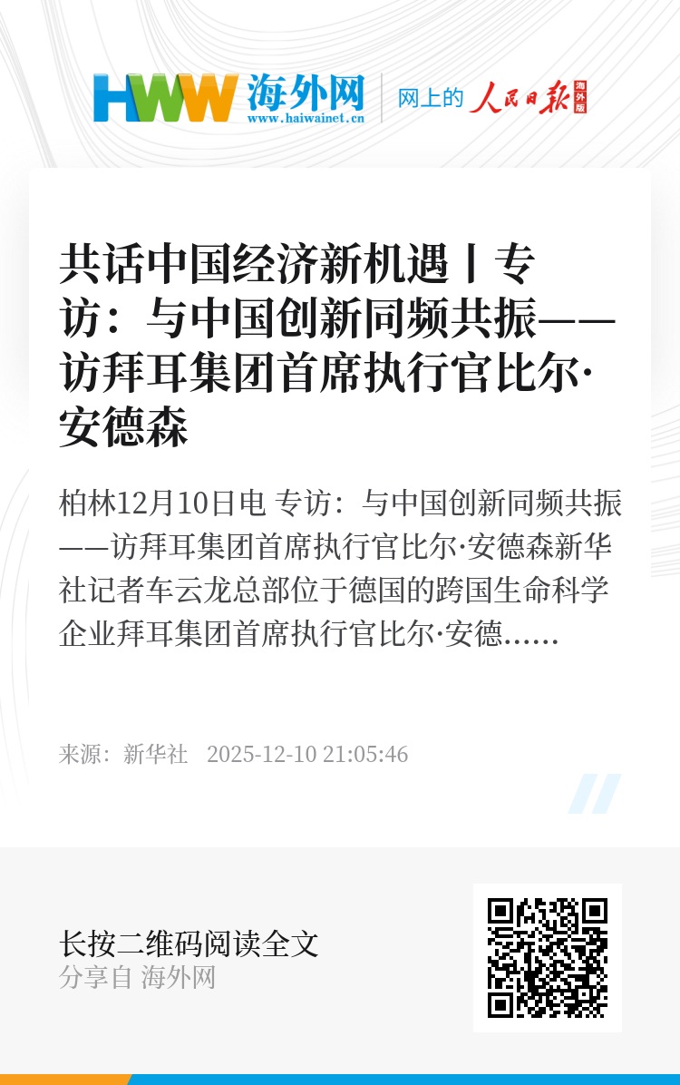 新华社柏林12月10日电 专访:与中国创新同频共振——访拜耳集团首席执行官比尔·安德森