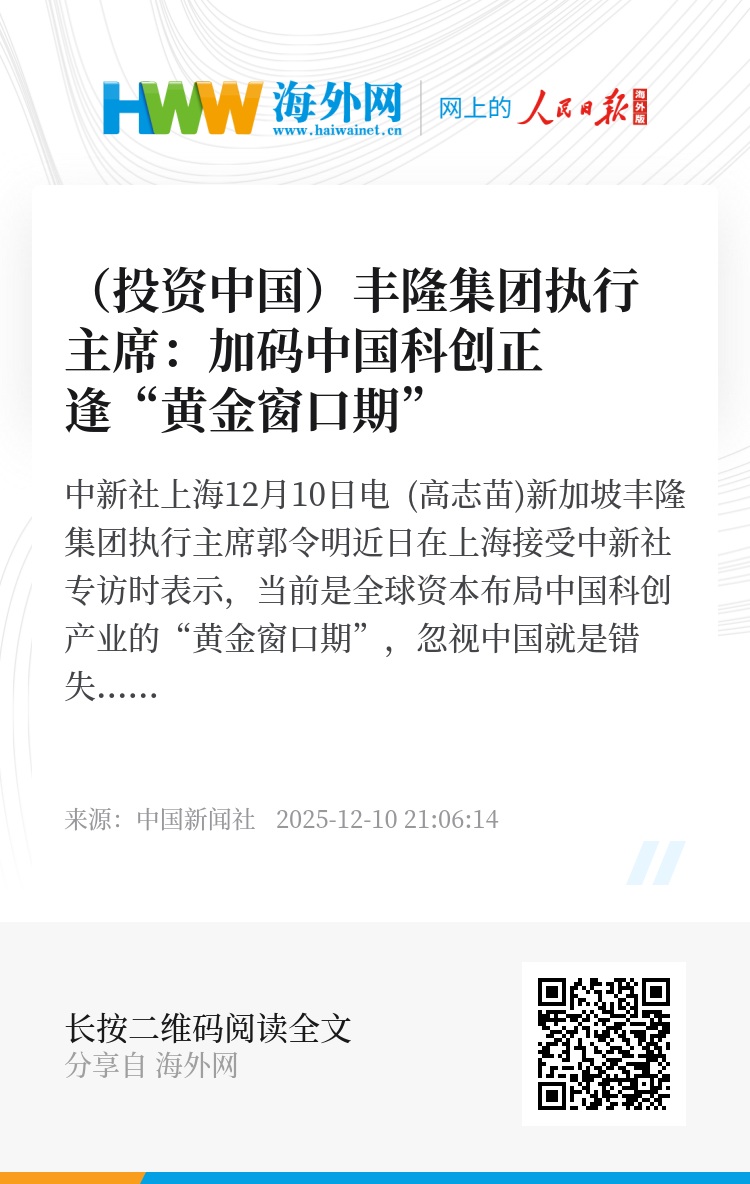 中新社上海12月10日电 (高志苗)新加坡丰隆集团执行主席郭令明近日在上海接受中新社专访时表示,当前是全球资本布局中国科创产业的“黄金窗口期”,忽视中国就是错失机会。