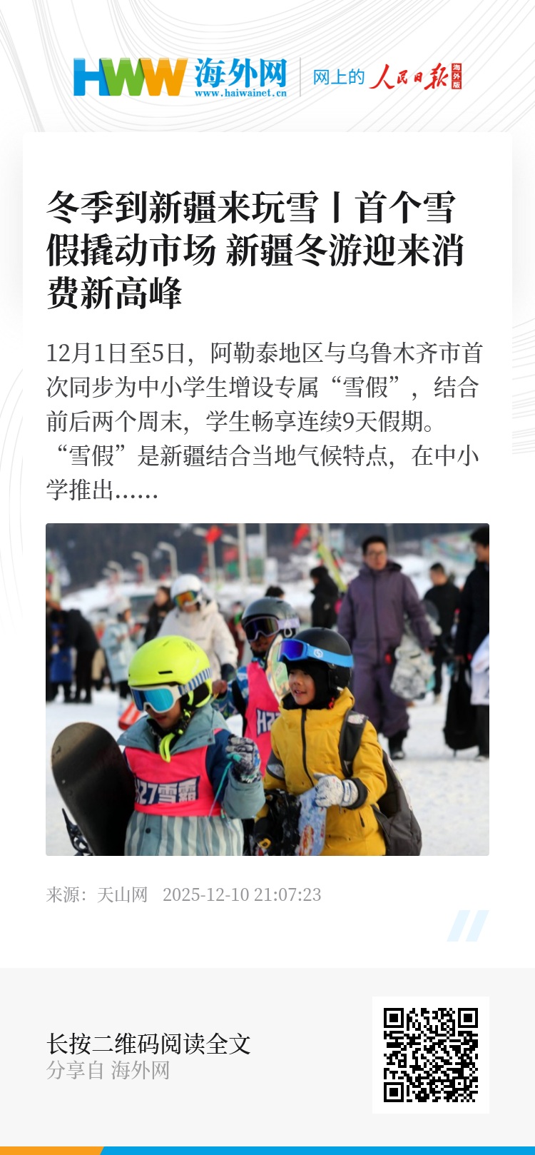 新疆首个“雪假”不仅满足学生冰雪活动需求,更有效点燃当地冬季旅游热度,带动冰雪相关场所客流持续攀升。