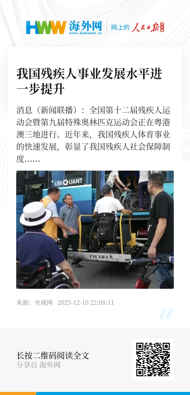 央视网消息(新闻联播):全国第十二届残疾人运动会暨第九届特殊奥林匹克运动会正在粤港澳三地进行。近年来,我国残疾人体育事业的快速发展,彰显了我国残疾人社会保障制度和关爱服务体系不断完善、个人发展能力不断提升。