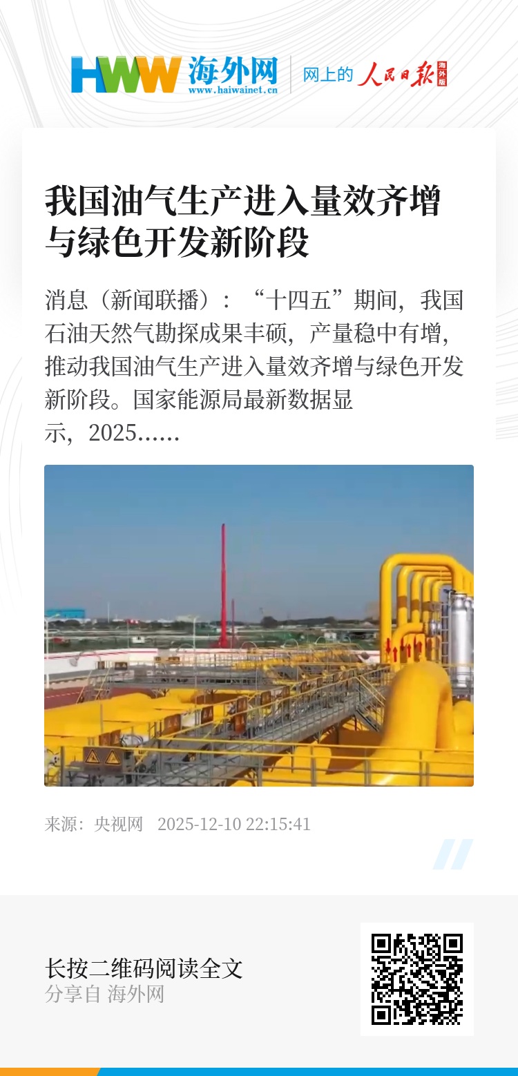 央视网消息(新闻联播):“十四五”期间,我国石油天然气勘探成果丰硕,产量稳中有增,推动我国油气生产进入量效齐增与绿色开发新阶段。