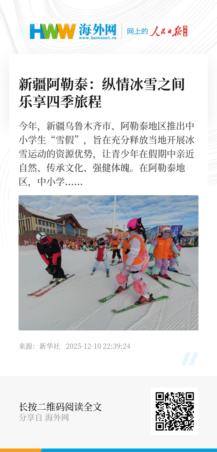 今年,新疆乌鲁木齐市、阿勒泰地区推出中小学生“雪假”,旨在充分释放当地开展冰雪运动的资源优势,让青少年在假期中亲近自然、传承文化、强健体魄。在阿勒泰地区,中小学生可拥有9天假期,共有约7.3万名在校生享受此次“雪假”。