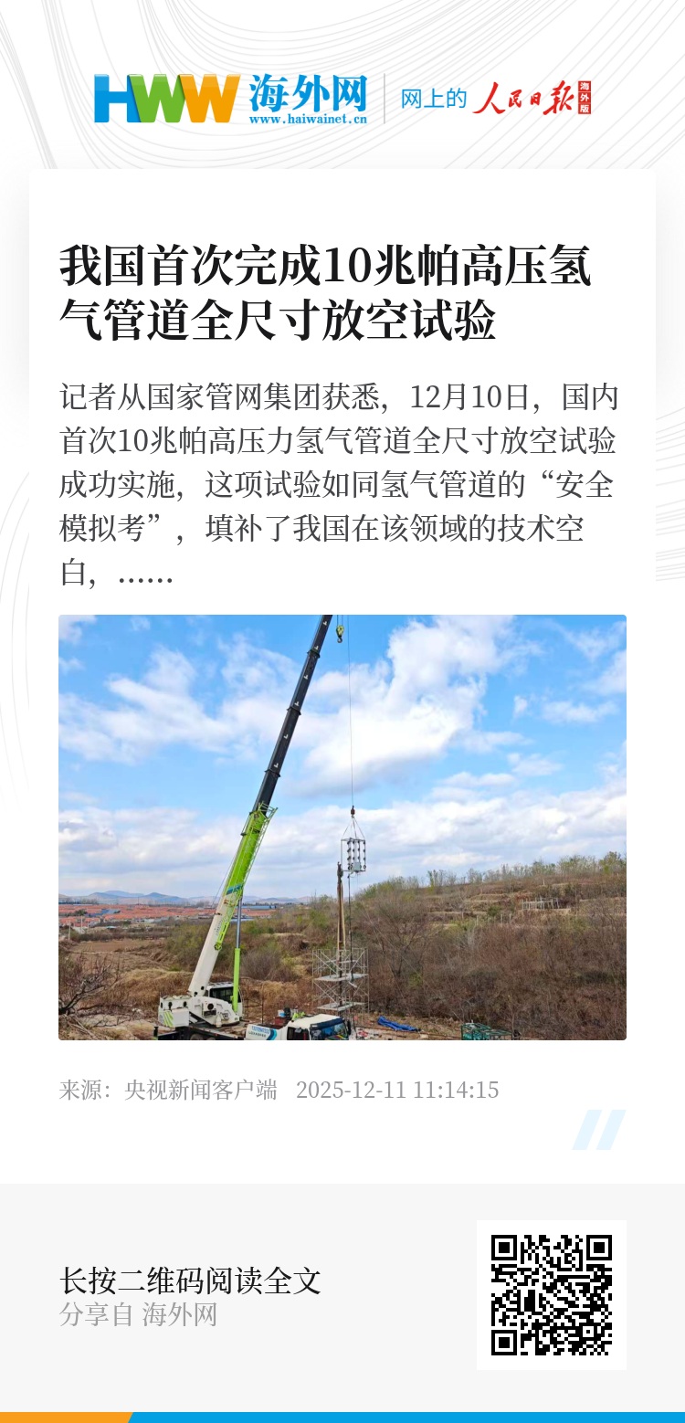 此次试验的成功,不仅解决了氢气储存与输送中的一项关键技术难题,也为我国氢能储运安全技术积累了重要经验。相关成果将有助于完善氢能行业安全标准,推动氢能产业链各环节协调发展,为我国氢能规模化应用提供坚实保障。(总台央视记者 王世玉 张伟)