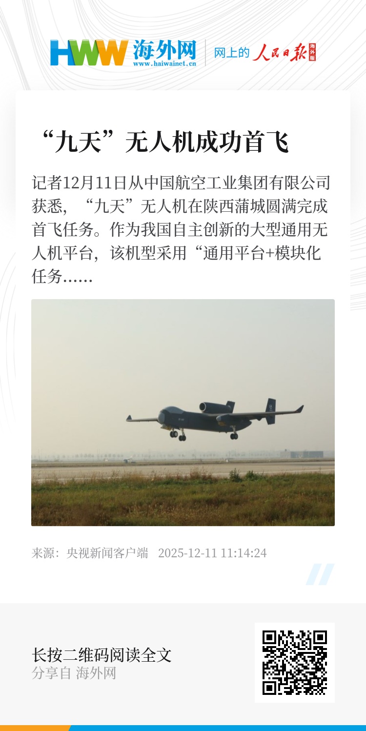 记者12月11日从中国航空工业集团有限公司获悉,“九天”无人机在陕西蒲城圆满完成首飞任务。