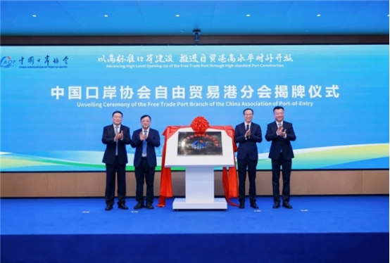 在与会嘉宾的共同见证下,举行了中国口岸协会自由贸易港分会揭牌仪式,标志着自由贸易港分会正式开启服务自贸港开放发展的新征程。