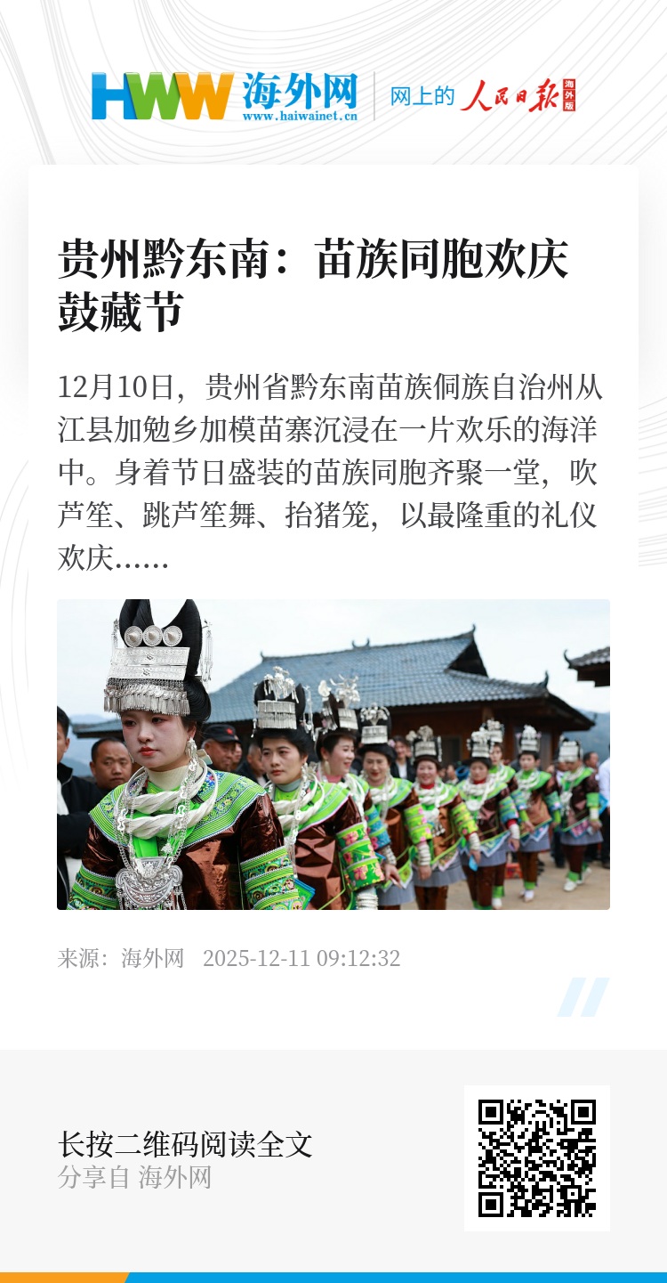 12月10日,贵州省黔东南苗族侗族自治州从江县加勉乡加模苗寨沉浸在一片欢乐的海洋中。身着节日盛装的苗族同胞齐聚一堂,吹芦笙、跳芦笙舞、抬猪笼,以最隆重的礼仪欢庆鼓藏节。图源:视觉中国