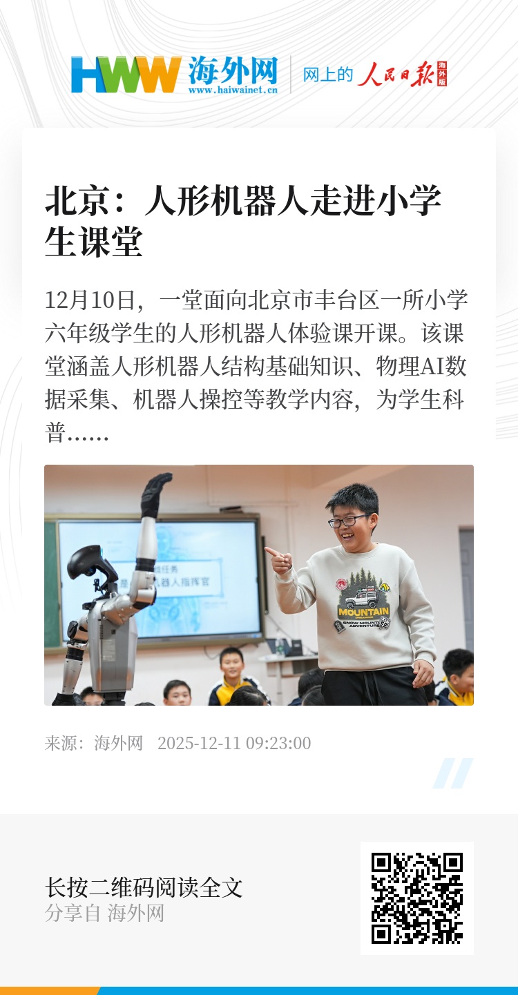 12月10日,一堂面向北京市丰台区一所小学六年级学生的人形机器人体验课开课。该课堂涵盖人形机器人结构基础知识、物理AI数据采集、机器人操控等教学内容,为学生科普前沿技术的同时,也提升了解决工程问题的能力。中新社记者 张祥毅/摄 图源:视觉中国