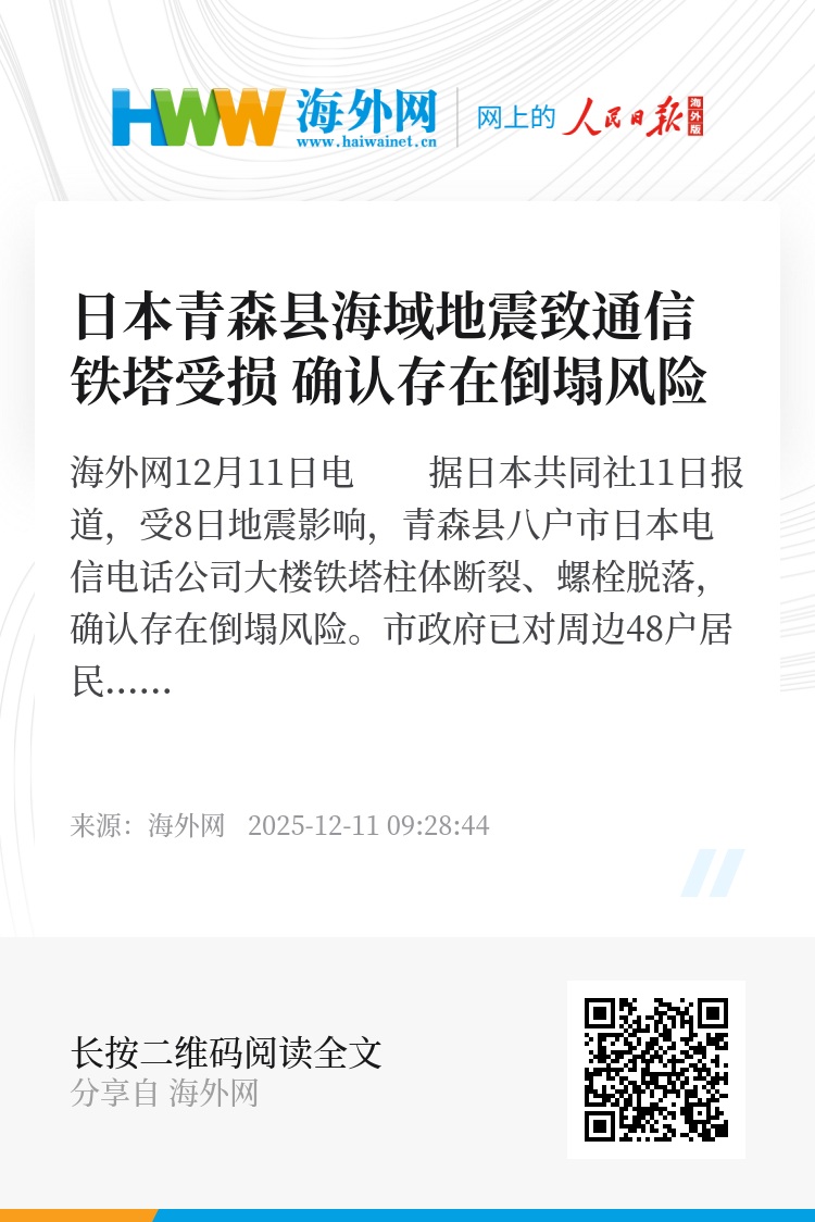 海外网12月11日电 据日本共同社11日报道,受8日地震影响,青森县八户市日本电信电话公司大楼铁塔柱体断裂、螺栓脱落,确认存在倒塌风险。市政府已对周边48户居民发布避难指示。该公司正在进行详细调查并向公众致歉。(海外网 田笑)