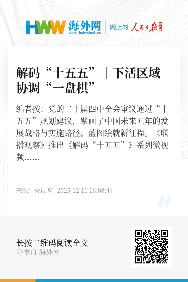 编者按:党的二十届四中全会审议通过“十五五”规划建议,擘画了中国未来五年的发展战略与实施路径。蓝图绘就新征程。央视网《联播观察》推出《解码“十五五”》系列微视频,与您一同聚焦宏伟新蓝图,洞察时代新脉动,解码发展新机遇,见证中国全面建设社会主义现代化国家的坚定步伐。