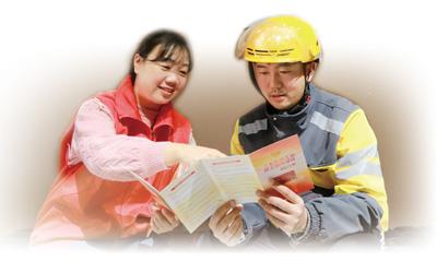 河南郑州,外卖员王光辉(右)在工会驿站了解保障政策。