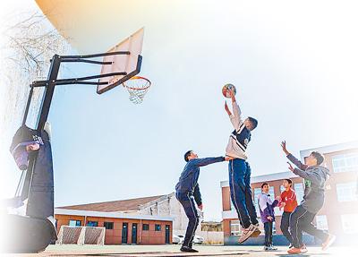 山西岚县普明希望小学,孩子们在打篮球。