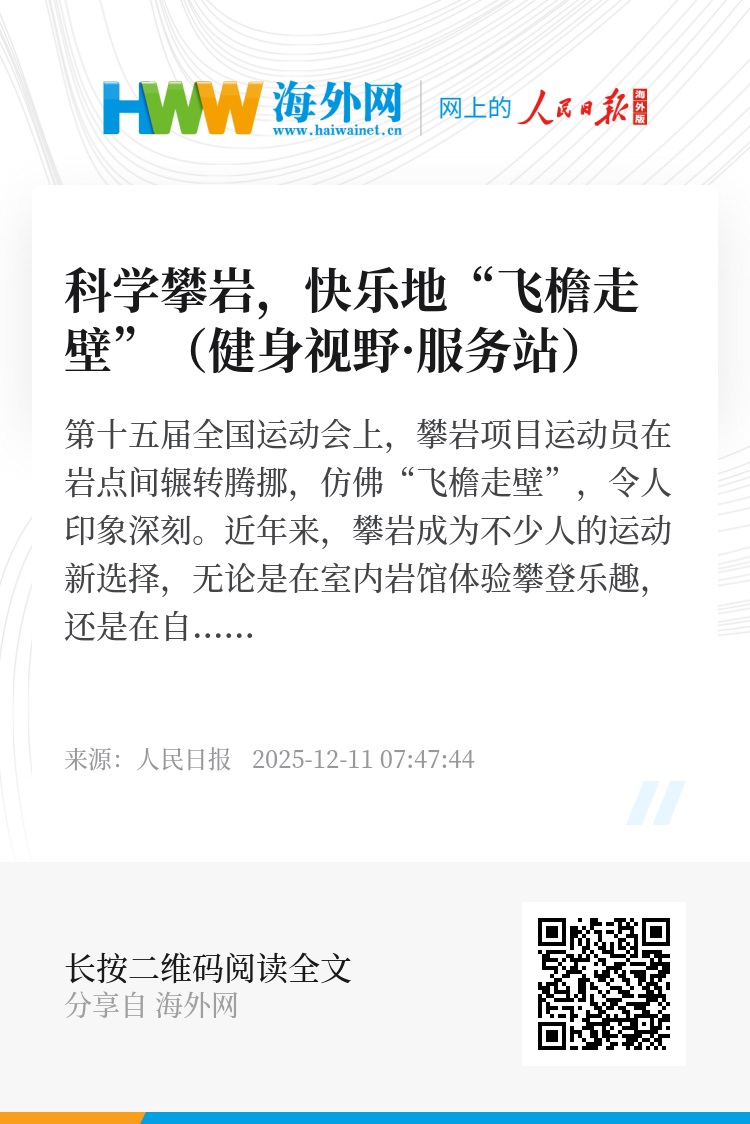 第十五届全国运动会上,攀岩项目运动员在岩点间辗转腾挪,仿佛“飞檐走壁”,令人印象深刻。近年来,攀岩成为不少人的运动新选择,无论是在室内岩馆体验攀登乐趣,还是在自然岩壁上挑战自我,每一次手脚配合向上攀登,都是力量与勇气的突破。